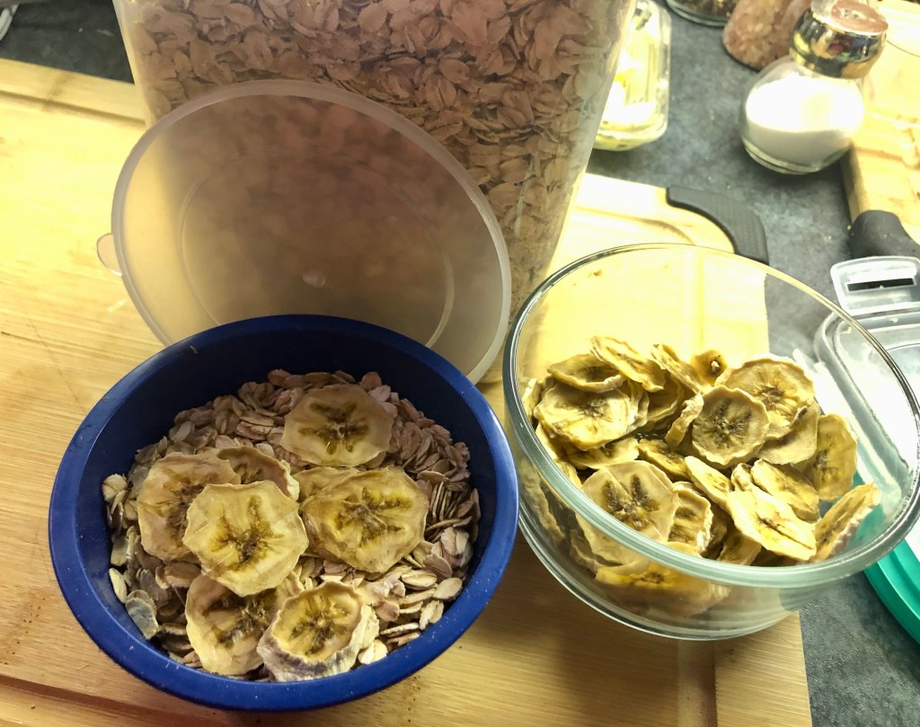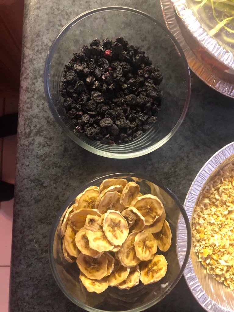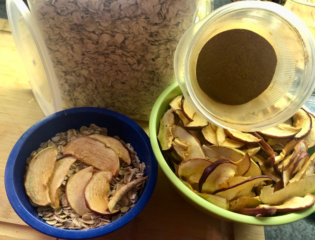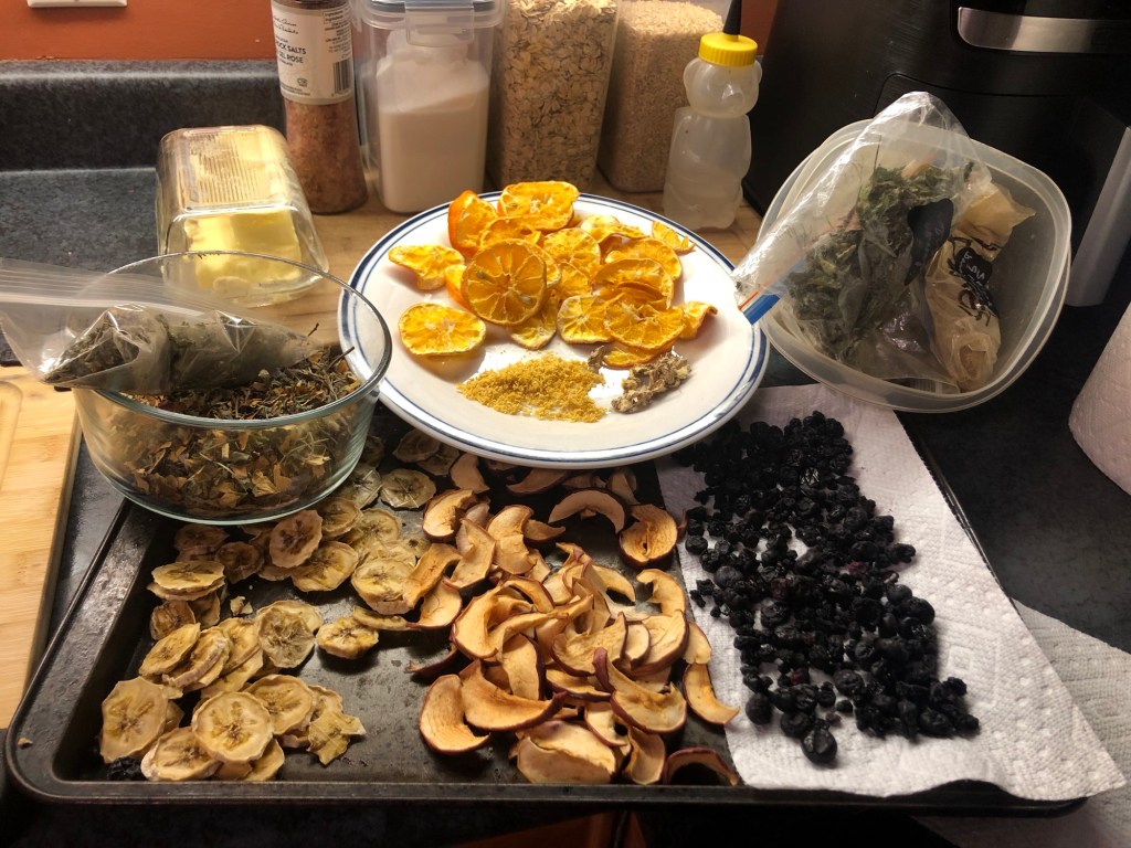 We’ve also been busy lovingly, preparing and drying herbs, fruits and berries to craft delicious, nutritious, one of a kind, blended teas, we are putting some aside for snacking and baking. Craft a high energy bowl of oatmeal and store it for a quick and easy breakfast. Throw some dried fruit into your pancake or waffle batter.