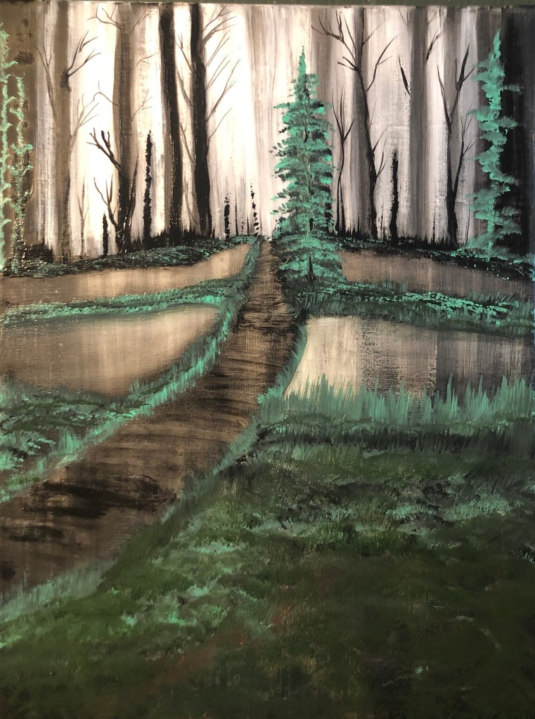 Spruce Bog Boardwalk at Algonquin Park Ontario Canada 3/8x18x24” Oil and Acrylic on Canvas Artist Tracy Schruder 2025