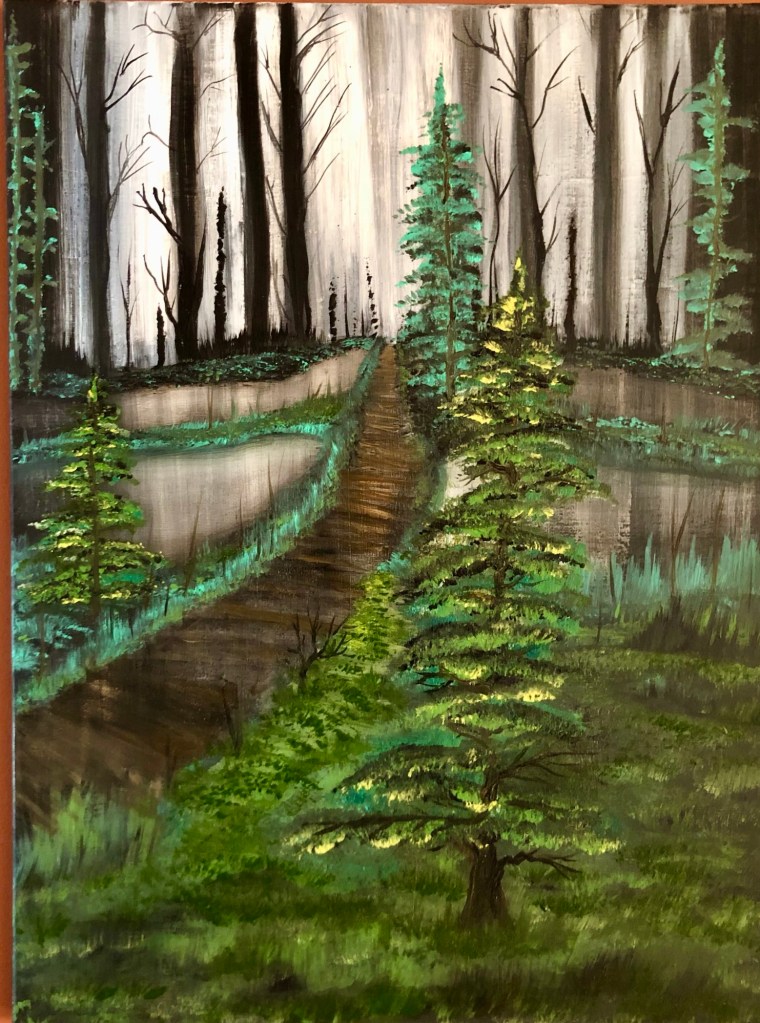Spruce Bog Boardwalk’ at Algonquin Park Ontario Canada 18×24 Oil on canvas. Painted by Tracy SchruderFinished!