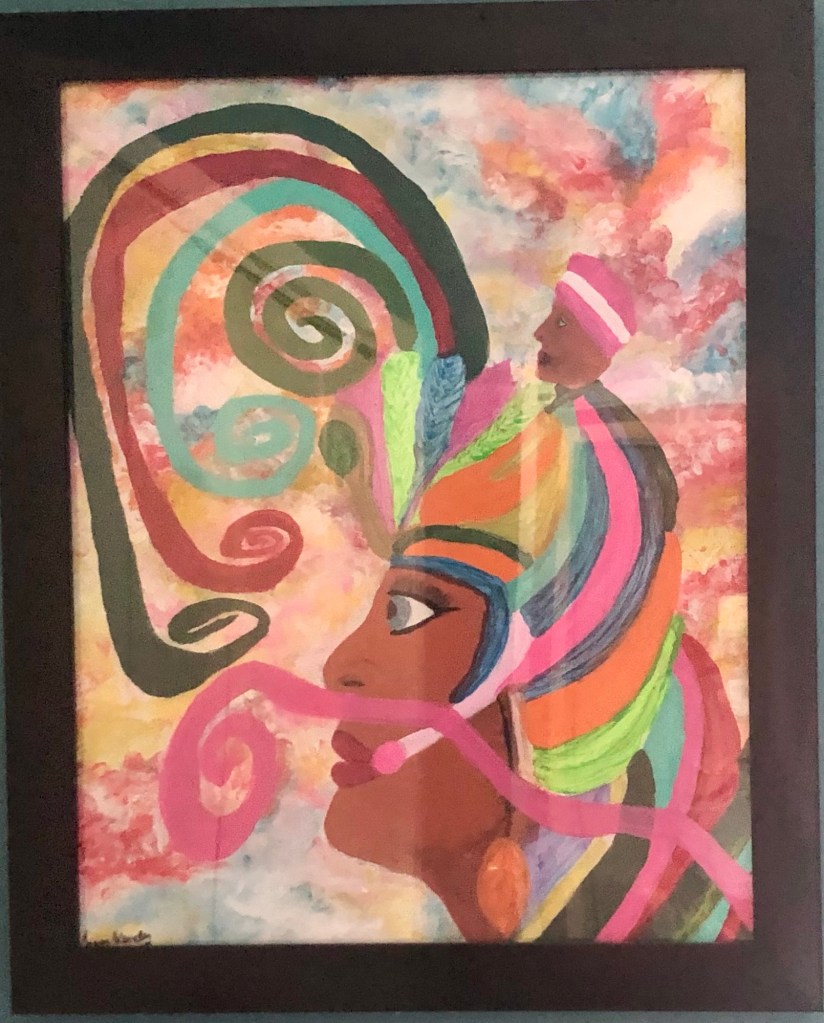 The figure’s elaborate, multicolored headwrap—layered in bold pink, orange, green and blue—mirrors the intricate jewelry you love to match with every outfit, each stripe a gem‑like facet reflecting personal expression and sensory experience. Her gaze is quiet yet penetrating, suggesting the Oneironaut’s ability to navigate inner landscapes with the same passion you pour into your oil paintings of mountains and your writings inspired by Dianne Ackerman’s sensory explorations.